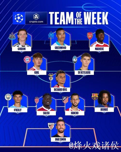 欧冠本周战罢,多场强强对话与青春风暴交织出新一轮话题焦点,欧足联官方也随之公布了本周最佳阵容。切尔西边锋马杜埃凯、巴萨多面手孔德以及拉齐奥前锋格林伍德三人领衔,占据了锋线与防线的核心位置,他们代表了本